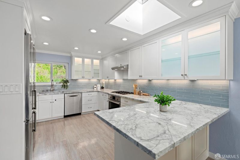 The stunning kitchen in this mid-century Sunnyside home was designed with the culinary enthusiast in mind. With approximately 24 feet of counter workspace, two refrigerators, skylight, abundant cupboard storage, and beautifully designed countertop and tile work, you're all set to take your cooking to the next level! The open-concept great room is bright and south-facing, and perfect for enjoying your gourmet meals, entertaining friends, or relaxing with family in the evening. Also on the main level are two spacious bedrooms, a full bath, and sweeping views of the Southern Hills from the living room and primary bedroom. On the entry level are two bonus rooms, a large foyer closet, the garage, a second bathroom and access to the private back patio. This is an ideal layout for those working from home who need two home offices. Or perhaps one office with a home gym, entertainment room, or hobby room. So many options! You'll have off-street parking for three cars: one in the garage and two in the driveway. The location is excellent for commuters because of its easy freeway and transit access. Within five blocks is the Glen Park BART station, plus six Muni lines: 23, 36, 35, 52, 44 and the J. You're also five quick blocks to the charming cafes and shops of Glen Park Village, which was named one of the coolest neighborhoods in the world in 2025 by Time Out Magazine!
