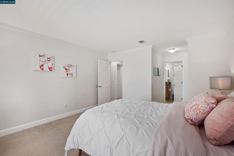 Beautifully maintained Eastridge upper-level condo at the top of San Ramon's Bollinger Canyon Rd. Gated community w/in a mile of City Center, year-round farmers market, The Marketplace shops, restaurants, Central Park, library, community ctr, Iron Horse Trail. 1074+/-SF. 2 bds w/en suite bathrooms, mirrored closet drs. 2 bathrooms w/single sink vanities, tub/shower combos. Inviting entry. Vaulted ceilings. Fresh int paint. Crown molding. Tile & carpeted floors. Updated central AC (2019). Abundant natural light. Living rm w/wood-burning fireplace, slider to view balcony & storage closet. Dining area, ceiling fan/light. Well-appointed kitchen w/granite counters, richly stained cabinetry, upper glass-faced cabinets, stainless steel refrigerator, new Samsung range, dishwasher & microwave. Front-facing window over stainless-steel sink. Washer/dryer behind closet drs. Multiple storage closets. Updated central AC (2019). Updated exterior. Exclusive enclave of condos on park-like grounds. Towering redwoods. Walking trails. App-controlled security gate. Access to 2 swimming pools, spas, gym. Entertain family & friends at clubhouse. Located between Canyon Lakes & The Bridges Golf Courses. Near freeway. Top-rated SRVUSD schools w/in 2 mi. Assigned parking space. Abundant guest parking.