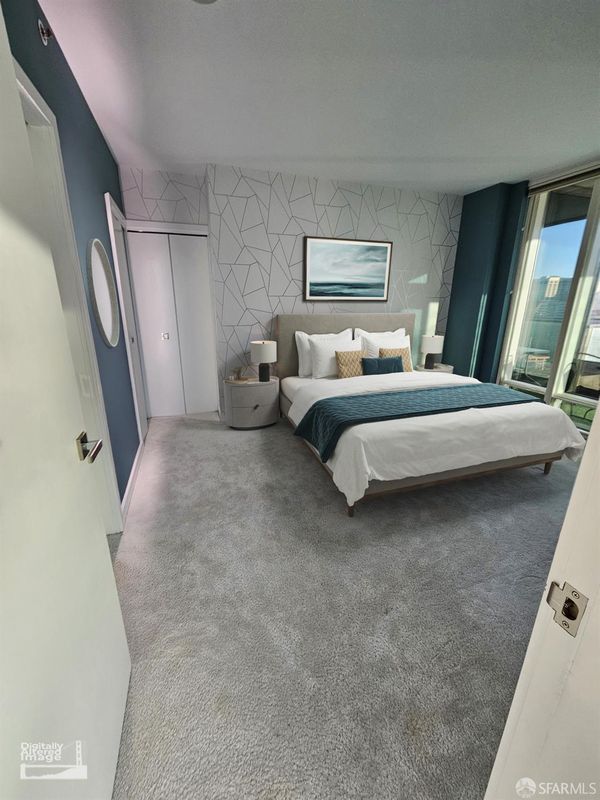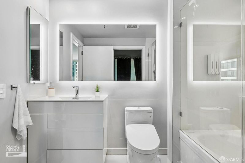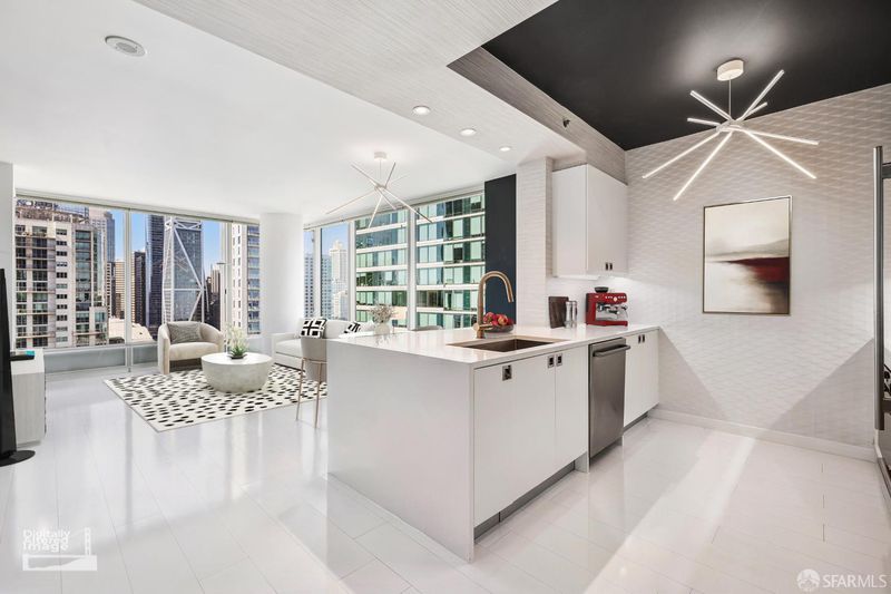 Elevate your lifestyle at One Rincon Hill with this stunning northeast corner residence in the sought-after 07-floor plan is a true masterpiece that blends design, technology, and breathtaking views. From the moment you step inside, you'll be captivated by bespoke panoramas of the Bay Bridge and San Francisco's iconic skyline, all framed by floor-to-ceiling windows. This turnkey home has been meticulously upgraded, offering seamless modern living. The Legrand Adorne Wi-Fi switches and dimmers enable effortless smartphone and voice control, while sleek gloss-white vinyl flooring creates a polished, contemporary vibe. The kitchen is a chef's dream, featuring an enlarged Pental Quartz peninsula with a waterfall edge, a Moen Nio smart faucet with touchless and voice activation, and advanced appliances, including a Bosch gas cooktop, KitchenAid microwave/oven combo, and Sub-Zero refrigerator. The spa-inspired primary bathroom exudes luxury, boasting a Toto Aquia IV toilet with Washlet S550e functionality, a Hansgrohe touchless faucet, a dimmable LED mirror, and a modern vanity with hidden electrical outlets. Every detail has been designed with convenience in mind. The living room is a showstopper, offering dual perspectives of the city and Bay waters. Custom enhancements like a reinforced TV wall mount with hidden wiring, pre-wired surround sound, and a dazzling Sputnik LED chandelier make this space as functional as it is beautiful. Step out onto the expansive patio to soak in sweeping north, east, and west-facing views, perfect for morning coffees or evening sunsets. As a resident of One Rincon Hill, you'll enjoy exclusive access to unparalleled amenities, including 24/7 concierge and valet services, two cutting-edge fitness centers, a heated pool, hot tub, BBQ areas, outdoor fireplace, steam room, and a luxurious clubhouse. The pinnacle of the experience? Private access to Uncle Harry's Penthouse Lounge at The Harrison, offering a chic setting to relax or entertain. Conveniently located near highways 101, 280, 80, and the Bay Bridge, this home offers not just an address but a coveted lifestyle where design, comfort, and connectivity converge seamlessly. Don't miss the opportunity to make this extraordinary property your own!