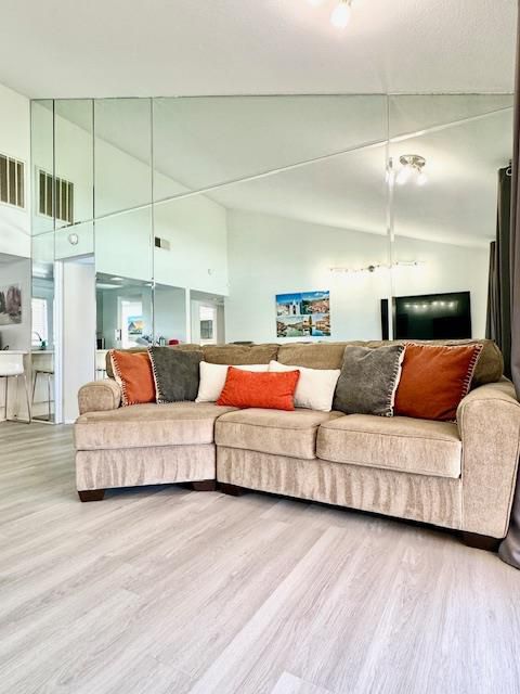 Welcome to your dream home in Palm Desert! This charming residence was recently upgraded. It offers 1,177 square feet of comfortable living space, featuring two bedrooms and two full bathrooms. The kitchen is a chef's delight with quartz and solid surface/Corian countertops, a skylight, and modern appliances including a microwave, oven range, and refrigerator. The open layout seamlessly connects the kitchen to the family room, creating a perfect space for entertaining. Enjoy the convenience of an inside laundry area, complete with a washer and dryer. The home's flooring consists of durable tile and vinyl/linoleum, providing both style and easy maintenance. The high and vaulted ceilings that enhance the sense of space. Beautiful view of golf court and pond from the living room and bedrooms on both side. The awning in the backyard will help to provide some shade in the hot season. The swimming pool is conveniently located across the street. This Palm Desert gem is ready for you to move in and start making memories.