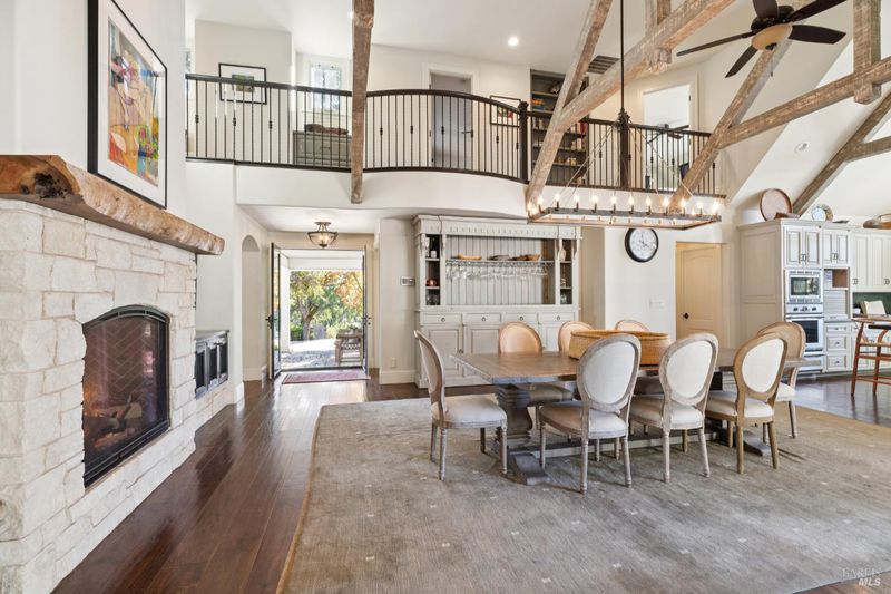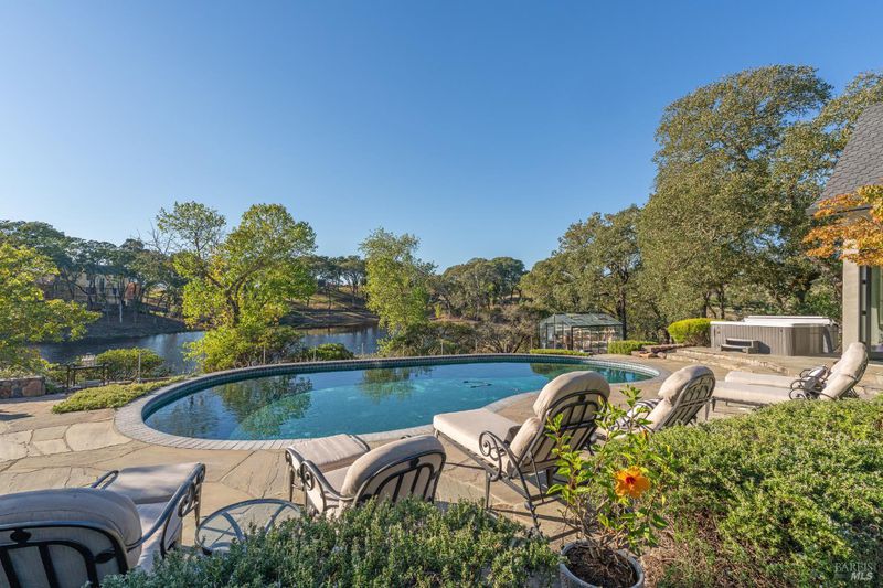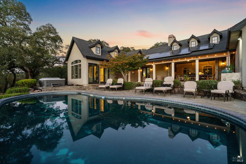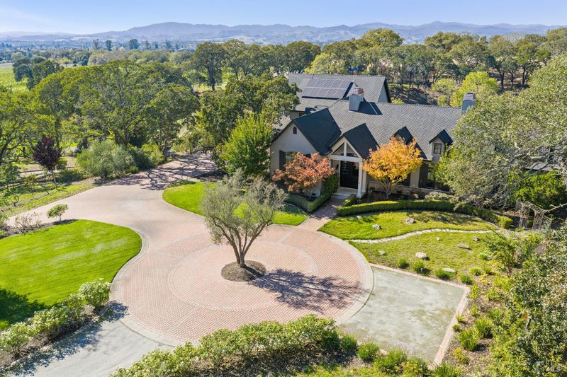 Behind gates and oriented to lake and vineyard vistas, this elegant estate pairs resort-style amenities with space to cultivate your own Wine Country lifestyle - think gardens, orchard, and room for animals - minutes from acclaimed wineries, dining, and luxury amenities. Inside, a chef's kitchen with large island and dual pantries opens to a vaulted dining room with fireplace. The living room's open-beam ceilings and dramatic fireplace frame wall - length accordion doors that blend indoors and out. Down a spiral stair, a wine cellar adds true Wine Country character. On the main floor, the primary wing offers a suite with fireplace, walk-in closet room, steam shower, soaking tub, plus a sunroom ideal as a gym or studio stepping out to the pool and hot tub. A main-floor office with full bath adds flexibility. Upstairs, two ensuite bedrooms take in hillside and vineyard views. Outdoors, enjoy a built-in BBQ kitchen, covered dining patio, bocce court, pool, hot tub, raised garden beds, and substantial orchard. Equestrian amenities include run-in shed, pasture, tack room with electricity and water, and access to nearby riding trails. Roughly 1hr from the Golden Gate, & 10min to Healdsburg square & the airport, your private Wine Country retreat offers every comfort close at hand.
