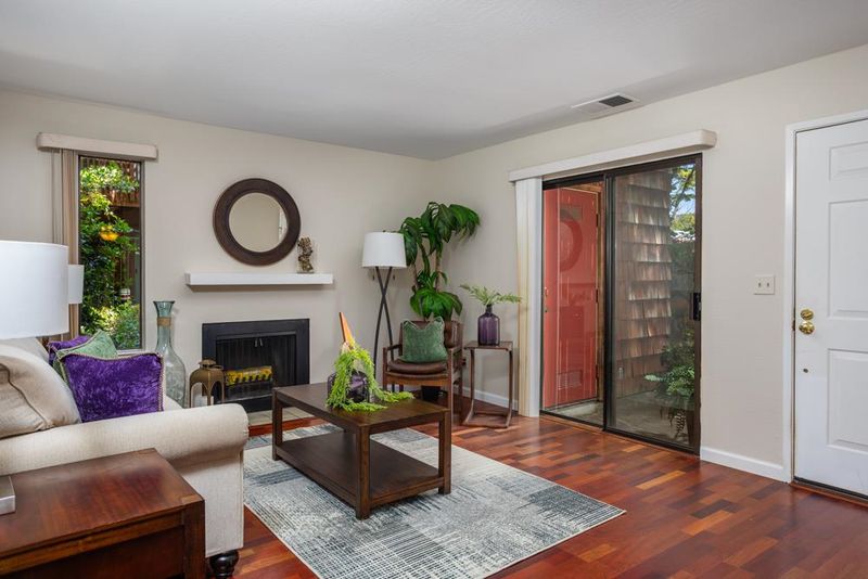End unit on ground floor with private front courtyard. Only a small step entry, naturally cool & shaded by a canopy of trees. Great layout with 2 bedrooms, 1.25 baths with sink in primary bedroom with french door to enclosed and private rear patio. 2nd bedrooms with sliding glass patio door. This home boasts an excellent floor plan featuring a spacious living room with cherrywood floors a cozy fireplace, a welcoming entry, and a dining area with ceiling fan & light all open to the kitchen. The kitchen is enhanced by quartz counters, light -colored cabinets with ample storage and pantry. The community offers serene, mature landscaping and a refreshing swimming pool. Coveted private access to Newhall Community Park.