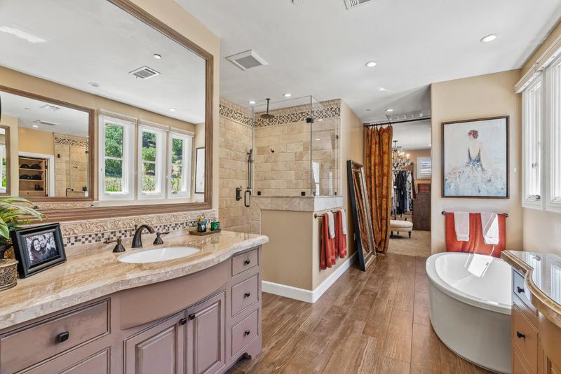 - Double Sinks, Half on Ground Floor, Outside Access, Primary - Oversized Tub, Primary - Stall Shower(s), Showers over Tubs - 2+, Tub in Primary Bedroom