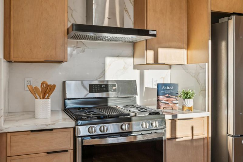 - Countertop - Quartz, Dishwasher, Hood Over Range, Oven Range - Built-In, Gas, Refrigerator