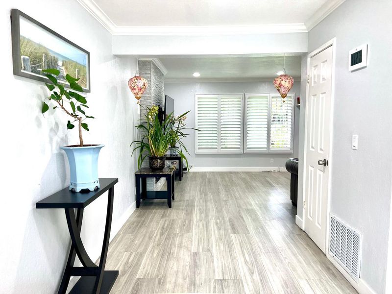 Beautiful and inviting townhouse offering 4 bedrooms with 2 full bathrooms and 1 half bathroom. Home was recently updated featuring new flooring, crown moulding, chic new paint, and upgraded bathrooms (including toilets, shower stalls, and sinks). You will love the bright and open floor plan, fresh kitchen with quartz countertops, tile backsplash, and updated stove/hood. This two-story townhouse has a separate indoor laundry room, a two-space carport, and recessed lighting throughout the home. Perfect for new families, the home is conveniently located near a community playground and easy access to grocery stores, dining, shopping, schools, and freeways.