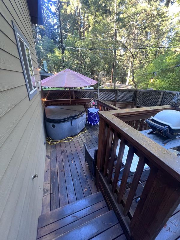 Welcome to Cliff View, an inviting mountain home nestled in the beautiful Santa Cruz Mountains. Step inside to vaulted ceilings and exposed wood ceiling and a stunning virgin-redwood wrapped beam that adds warmth and character. The modern kitchen features custom cabinets, Corian countertops, and a full suite of appliances, opening directly into the family room for comfortable, connected living. The main level offers one full-sized bedroom, while upstairs includes a second full-sized and another smaller room perfect for a child, office, or play space. Enjoy indoor-outdoor living on the beautiful deck surrounded by redwoods. Outside, oversized parking easily accommodates an RV or boat. With its natural finishes, flexible layout, and peaceful mountain setting, this home offers charm and comfort.