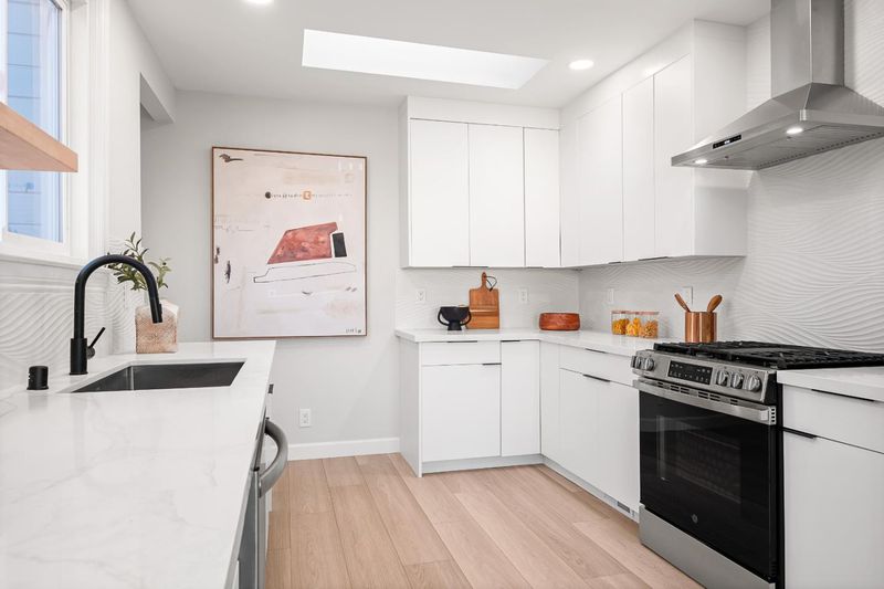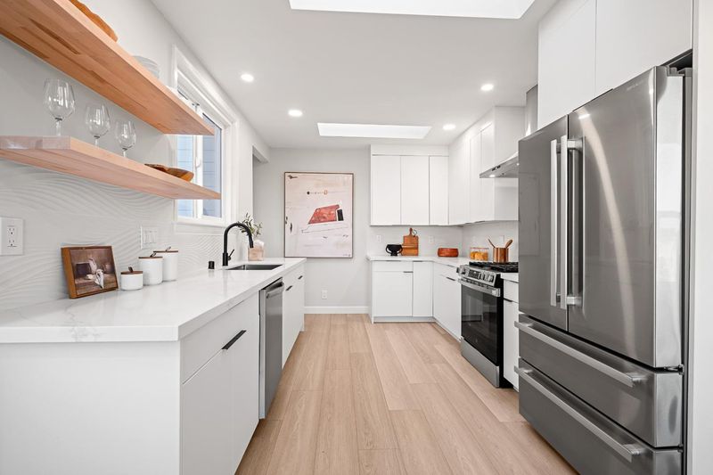 - Dishwasher, Garbage Disposal, Hookups - Gas, Hood Over Range, Countertop - Quartz, Exhaust Fan, Oven Range - Gas, Refrigerator, Skylight