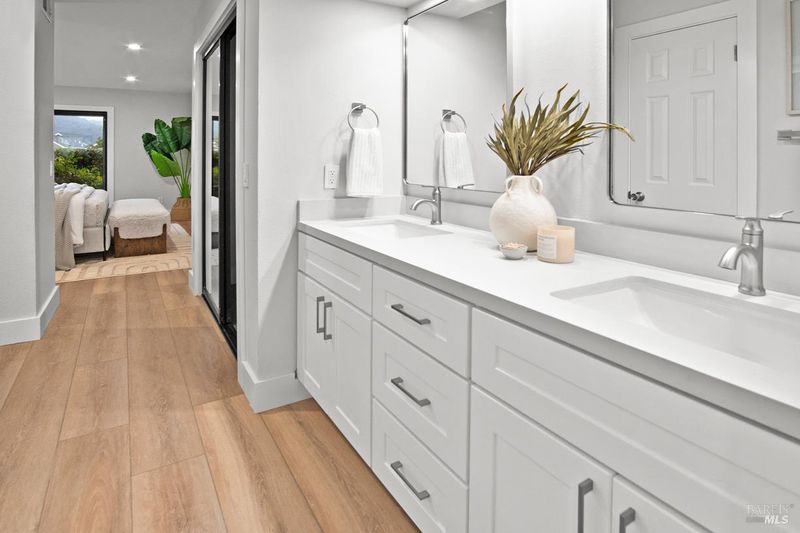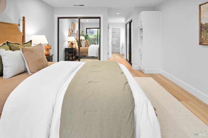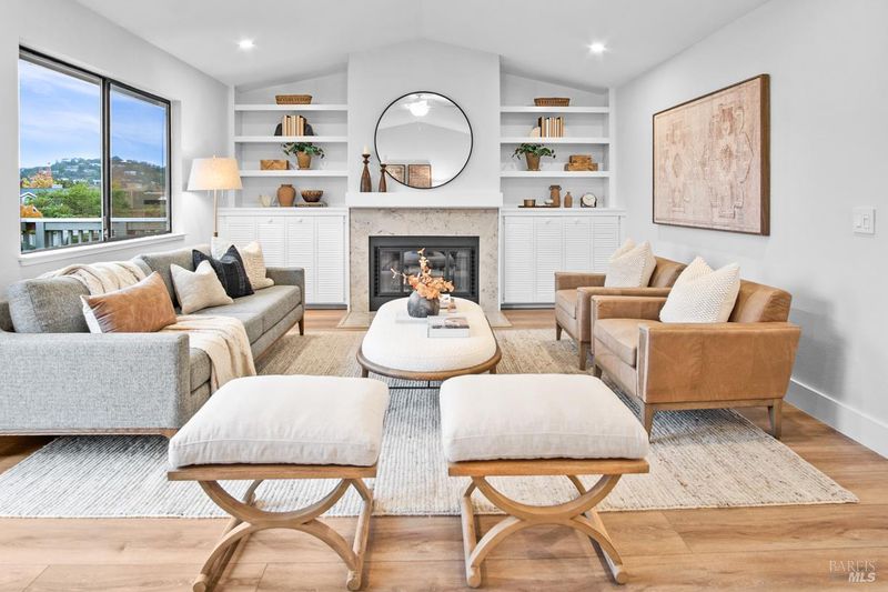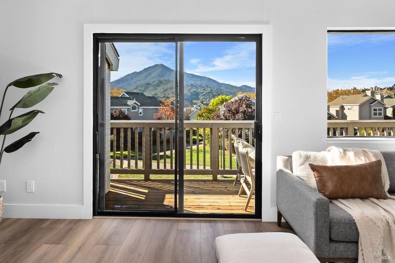 Beautifully remodeled split level town home in the desirable Drakes Landing Complex. Private gated entrance follows a floral path to entertaining patio and front door. The front terrace gives a lovely extension of usable space for cozy outdoor gatherings. The entry level of the home includes a third bedroom or office with garage access. Two spacious primary en-suites bedrooms each with their own private patios are located on the lower level along with laundry area. The main and upper level provides for a lovely living room setting with a Stunning Mt. Tam backdrop. A spacious kitchen, with new appliances along with a sunlit breakfast nook flows from the dining area, which sits adjacent to the open air living room. The living room, boasts cathedral ceiling, recessed lighting, built in fan, attached deck overlooking beautiful Niven Park, oh, did I mention the stunning Mt. Tam views? There is an elegant guest bathroom on this level as well. Also included is a full two car garage providing plenty of extra storage. The well maintained complex provides a sunny setting for relaxing in the pool or spa. Only a few minutes walk and you are are enjoying markets, restaurants, coffee shops, stores and transportation.