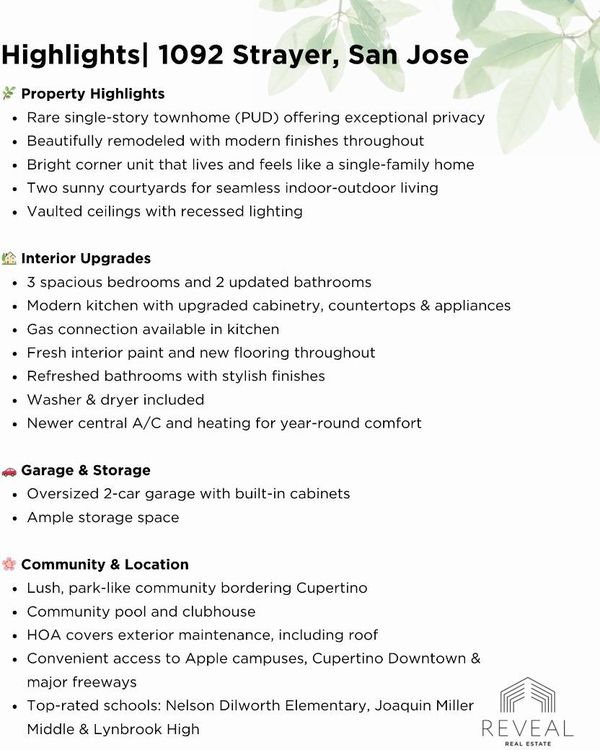 A rare SINGLE LEVEL townhome (PUD), BEAUTIFULLY REMODELED and nestled within a lush, park-like community bordering Cupertino and served by TOP-RATED SCHOOLS, including LYNBROOK HIGH (walking distance). This bright CORNER unit lives like a single-family home, offering EXCEPTIONAL PRIVACY with 3 SPACIOUS BEDROOMS and 2 UPDATED BATHS. VAULTED CEILINGS with recessed lighting and TWO SUN-FILLED COURTYARDS create a seamless indoor-outdoor flow perfect for everyday living and entertaining. The MODERN KITCHEN showcases SLEEK CABINETRY, NEWER APPLIANCES, and a GAS CONNECTION, while both bathrooms have been TASTEFULLY REMODELED. Additional highlights include FRESH INTERIOR PAINT, CONTEMPORARY FLOORING THROUGHOUT, a WASHER & DRYER, and NEWER CENTRAL A/C AND HEATING for year-round comfort. The OVERSIZED TWO-CAR GARAGE features BUILT-IN CABINETRY and ABUNDANT STORAGE. Enjoy RESORT-STYLE AMENITIES with a COMMUNITY POOL AND CLUBHOUSE, while the HOA COVERS EXTERIOR MAINTENANCE, including the roof, for TRUE LOW-MAINTENANCE LIVING. Ideally located near APPLE CAMPUSES, CUPERTINO DOWNTOWN, and MAJOR FREEWAYS, and ZONED FOR AND WALKING DISTANCE TO HIGHLY ACCLAIMED SCHOOLS: NELSON DILWORTH, JOAQUIN MILLER MIDDLE, AND LYNBROOK HIGH.