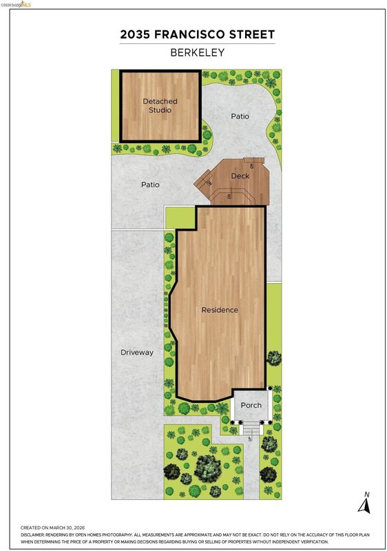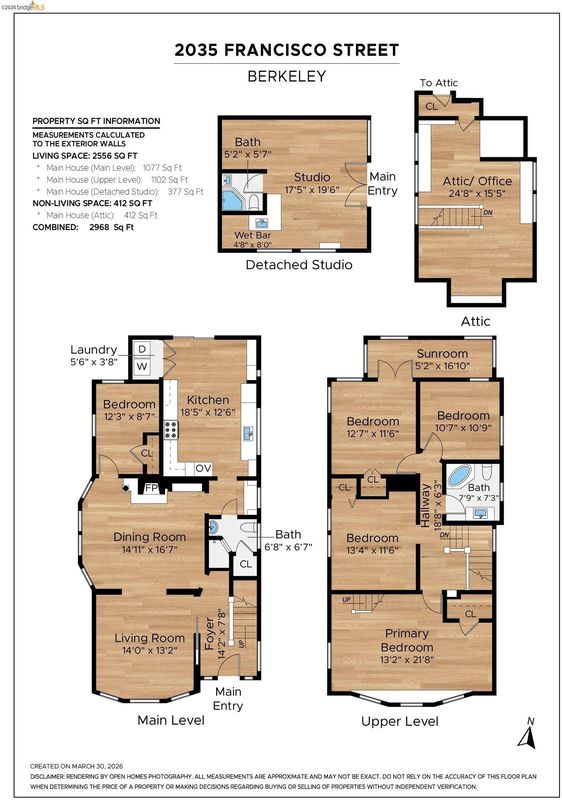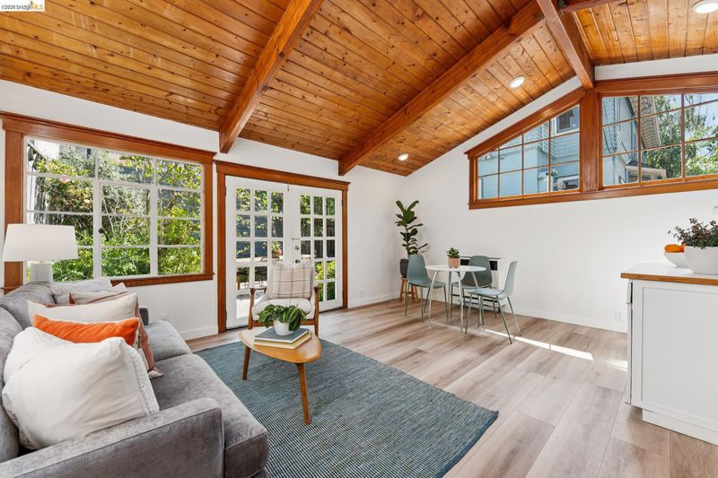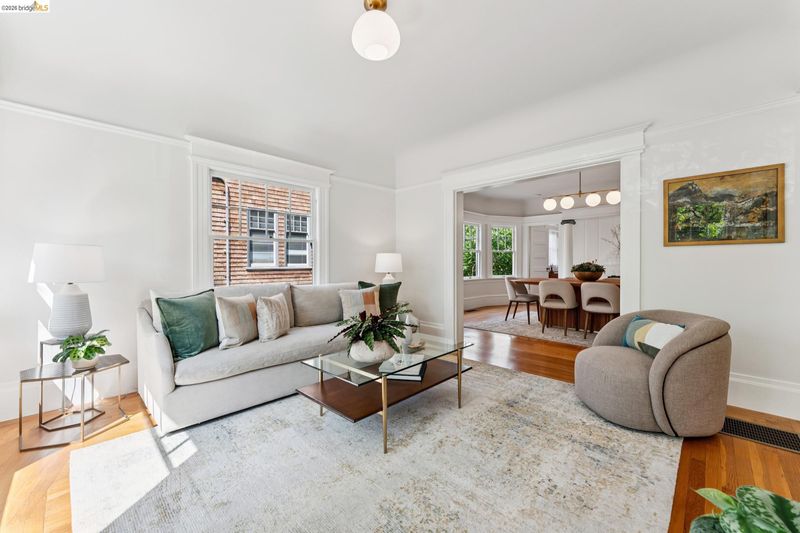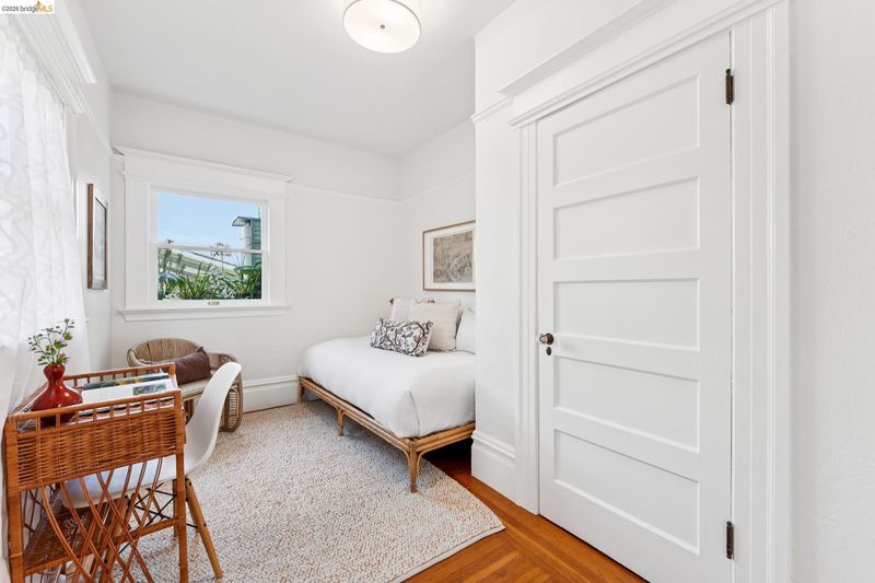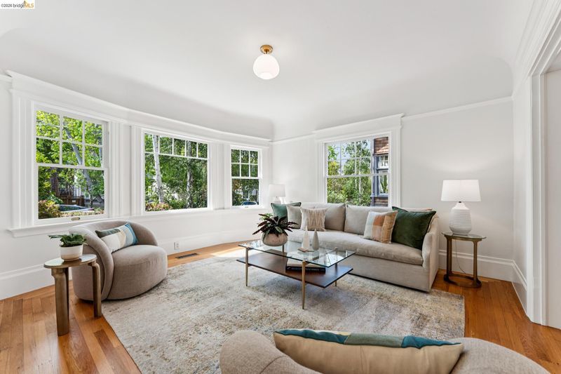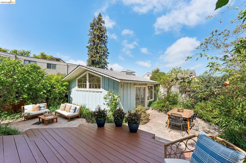 Welcome to 2035 Francisco St, a distinguished Neoclassical Structure of Merit in the heart of North Berkeley’s famed Gourmet District, where world-class dining, beloved cafés and daily conveniences are just steps away. This architecturally rich home offers 5 bedrooms, 2 baths, and a finished attic retreat with sweeping treetop, Bay and City views—an inspiring space for work or reflection. The chef’s kitchen features a 6-burner Wolf range, double oven, Thermador refrigerator and refined finishes, flowing into sunlit living and dining areas designed for comfort and connection. Refinished oak floors, coved ceilings, pocket doors, leaded glass windows and a classic dining fireplace showcase timeless character. French doors open to a generous deck and lush patio ideal for dining al fresco, entertaining or relaxing in a private garden retreat. A detached studio with full bath and soaring pine ceilings offers flexible guest or creative space. Custom exterior paint with pressed gold leaf accents highlights the home’s elegance. Upgrades include newer roof, tankless water heater and heat pump system. Long driveway fits 3–4 cars tandem. Moments to North Shattuck shops, The Cheese Board, Chez Panisse, UC Berkeley and BART. Walkscore – 98. Bikescore - 95. Home Energy Score of 5.
