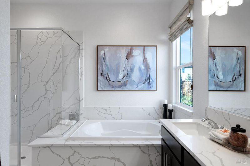 - Double Sinks, Shower Stall(s), Soaking Tub