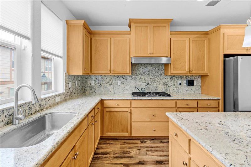 - 220 Volt Outlet, Cooktop - Gas, Countertop - Granite, Dishwasher, Exhaust Fan, Garbage Disposal, Hookups - Ice Maker, Island, Microwave, Oven Range - Built-In, Oven Range - Electric, Refrigerator