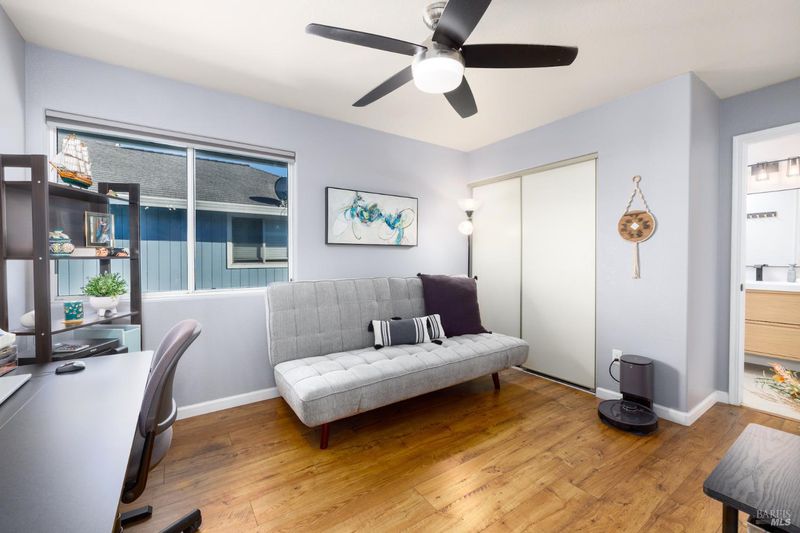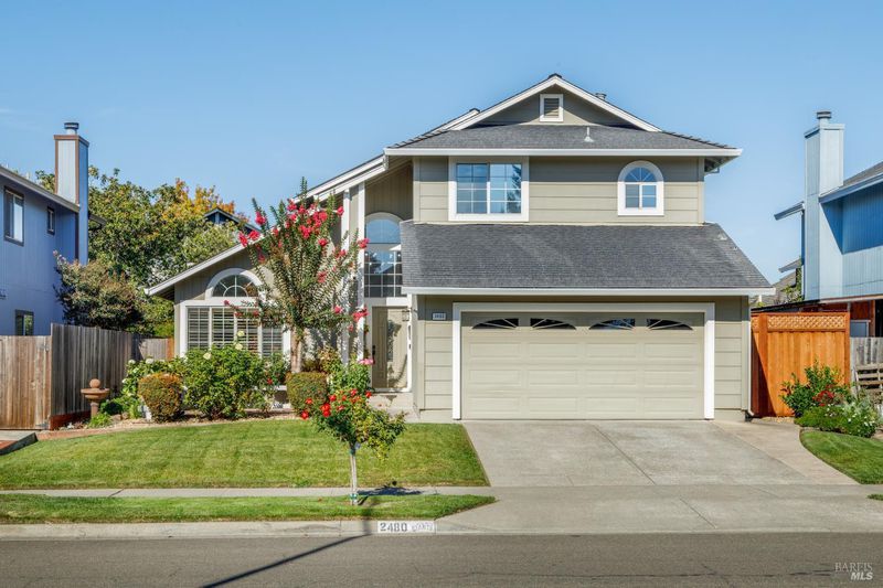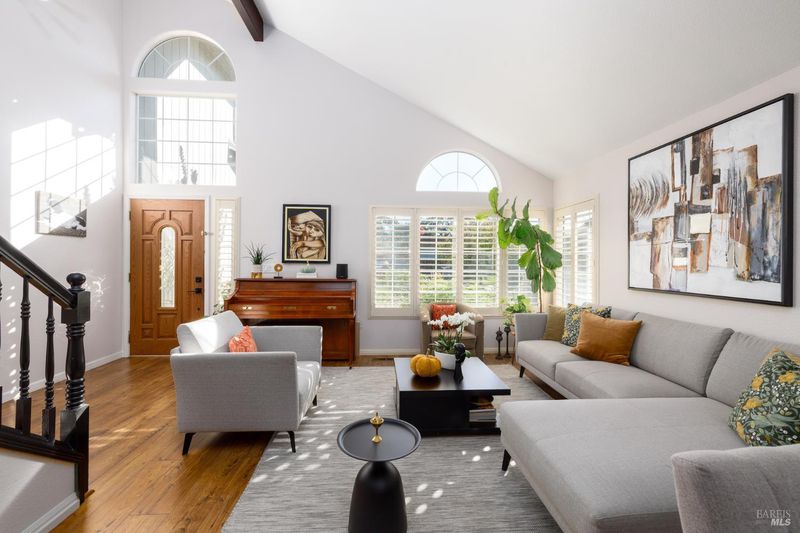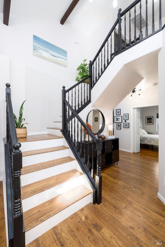 Impeccably maintained and thoughtfully updated, this elegant two-story residence harmoniously blends modern sophistication with inviting warmth. Featuring four bedrooms and three remodeled bathrooms, the home provides a bright, airy ambiance with vaulted ceilings, laminate flooring, and abundant light. The remodeled open-concept kitchen flows effortlessly into the family room, creating a welcoming space for everyday living and entertaining. The wood-burning fireplace adds a touch of classic charm. French doors off the kitchen open to the semi-enclosed deck, extending the living space outdoors. One bedroom and a full bath on the first floor. Upstairs, the primary suite provides a tranquil retreat, complete with a bay-window seat and reading nook, framed by expansive windows. The remodeled ensuite bath is a luxurious sanctuary featuring a walk-in shower and a dual-sink vanity with designer finishes. Outdoors, the property is equally impressive. The landscaped gardens showcase multiple areas designed for relaxation and entertaining, including a covered deck, a spa, a lush lawn, raised garden beds, and a gazebo, the perfect setting at any time of day. With solar panels and numerous improvements, this residence exemplifies an ideal balance of style, comfort, and sustainability.