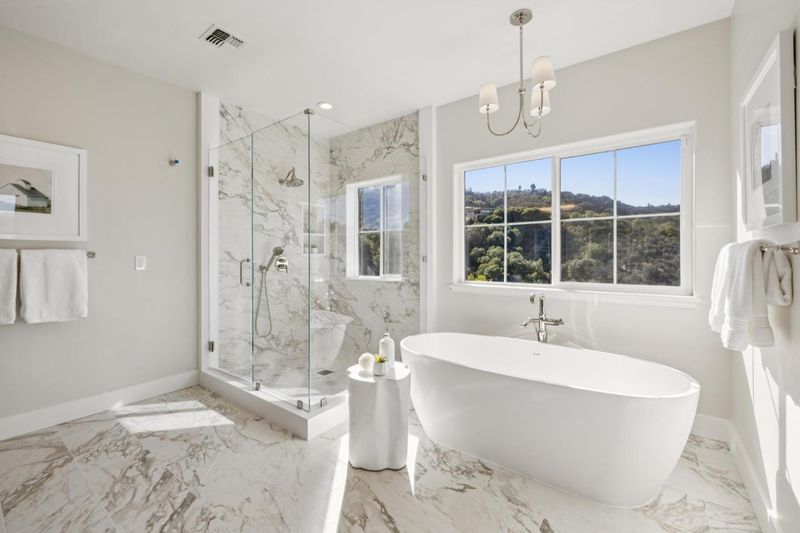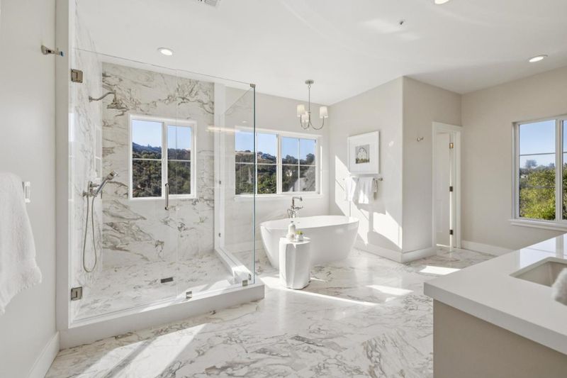 - Marble, Stall Shower, Full on Ground Floor, Primary - Oversized Tub, Primary - Stall Shower(s)