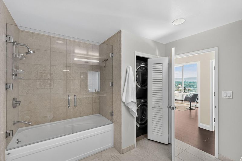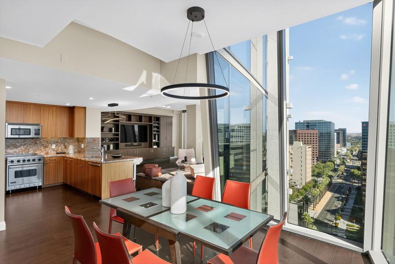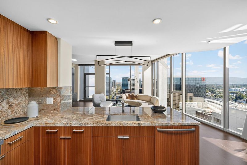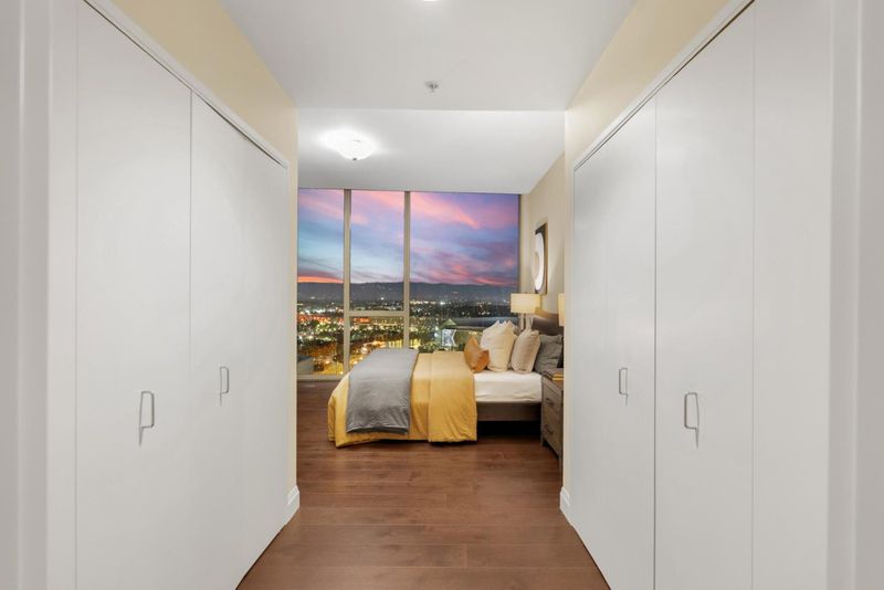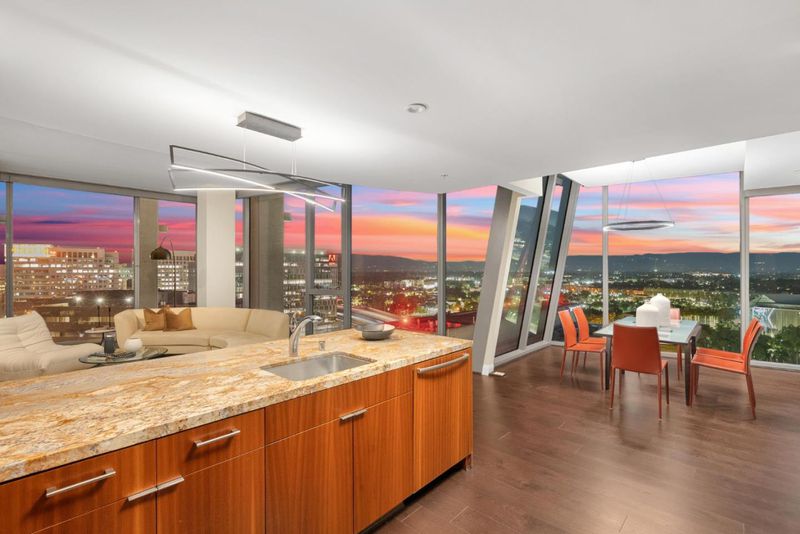 This stunning corner residence soars above the city on the 20th floor, wrapped in floor-to-ceiling windows that capture jaw-dropping, unobstructed views in every direction. The dramatic entry foyer sets the stage, drawing your eye straight to the skyline. Sophisticated details include automatic one-touch shades, granite countertops, a built-in Sub-Zero refrigerator, a dedicated dining area framed by breathtaking vistas, and a dry bar accented with an elegant chandelier. The living room features a custom-built TV wall with shelving and a Juliet balcony window for fresh air and light. The primary suite showcases west-facing sunset views, soaring ceilings, a stall shower, and a soaking tub, while the second bedroom offers flexibility for guests or a home office. This rare unit also includes highly coveted private storage. Live in luxury with 24-hour concierge service, a fully equipped fitness center, residents lounge for entertaining, poolside lounge areas with an outdoor fireplace, bbq stations and a 2 relaxing jacuzzis. Situated in the heart of downtown San Jose, you're just steps from San Pedro Square, the SAP Center, local farmers markets, light rail, and Diridon Station. Experience the ultimate in elevated urban living-welcome to the AXIS lifestyle.