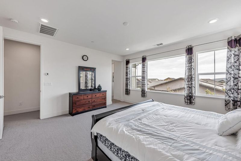 North facing, bright and gorgeous contemporary home in the desirable community of The Preserves in Westside San Ramon. Attractively priced. Beautiful gourmet kitchen dining combo enjoys the spacious island with a prep sink, contemporary styled cabinetry, quartz counters, beautiful backsplash, gas cooktop, pantry, stainless steel appliances. This meticulously maintained home features a spacious Master suite with a nice view, spacious bathroom with two vanities, Soaking Tub and Standing Shower, 2 walk-in closets-One for Her and One for Him, Beautiful mountain view from the bedrooms. 2 more bedrooms upstairs with Full bath and a convenient main floor bedroom and full bath perfect for the in-laws and guests. Large loft upstairs can be used for media room or can convert to another big bedroom. This house has a fully paid solar system ensuring energy efficiency. The family room and dining room opens up to a serene backyard that is perfect for outdoor dining and relaxation. Community amenities include a park, fire pit, bocce ball court, playgrounds, clubhouse, swimming pool, barbecue pit..Don't miss this opportunity to own this beautiful move-in-ready home in a prime location with top ratings schools.