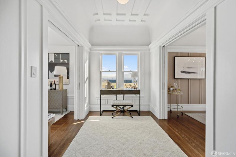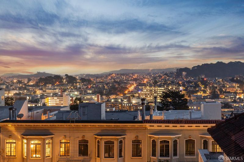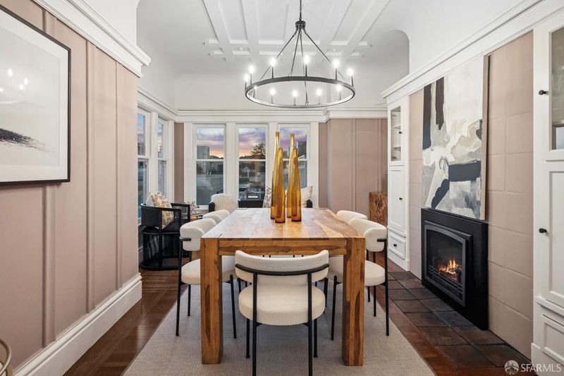 Enchanting 2BR top floor Arts & Crafts home with extravagant period detailing and spectacular panoramic views -- like a cottage in the sky! Luminous with windows on all four sides, large formal living and dining rooms -- both with fireplaces. Deluxe chef's kitchen with quartz countertops and abundant cabinetry, two serene bedrooms and a spa-like marble bathroom with soaking tub. In-unit laundry, huge lockable storage room on-site and garage parking next door. At the top of the stairs in Jackson Terrace. Superb, sublime & one of a kind!