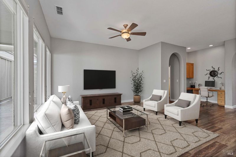 Beautiful and Bright Asti Model on a generous corner lot! Welcome home to 350 Canyon Springs Dr in the desirable Trilogy at Rio Vista, a vibrant 55+ active adult community. This spacious 2,302 sq ft home offers 2 bedrooms, 2.5 baths, plus a den/office - ideal for hobbies, work from home, or a quiet retreat. The open floor plan features high ceilings, abundant natural light, and great entertaining spaces including a formal living/dining room and a separate family room off the kitchen. Guests will love the private guest bedroom with en-suite bath, while the large primary suite features a tray ceiling, jetted soaking tub, separate shower, dual vanities, and two walk-in closets. Enjoy newer laminate flooring throughout, a recently replaced HVAC system, and stainless steel kitchen appliances (all replaced within the last 1-3 years). The outdoor space offers low-maintenance drought-tolerant landscaping, a tiled courtyard, and a covered back patio with windbreak. A third-car garage is perfect for your golf cart or extra storage. Conveniently located near The Clubhouse and Health & Wellness Center. Experience resort-style living with pools, clubhouses, a fitness center, tennis/pickleball courts, bocce ball, walking paths, a dog park, and a public golf course with restaurant and pro shop.