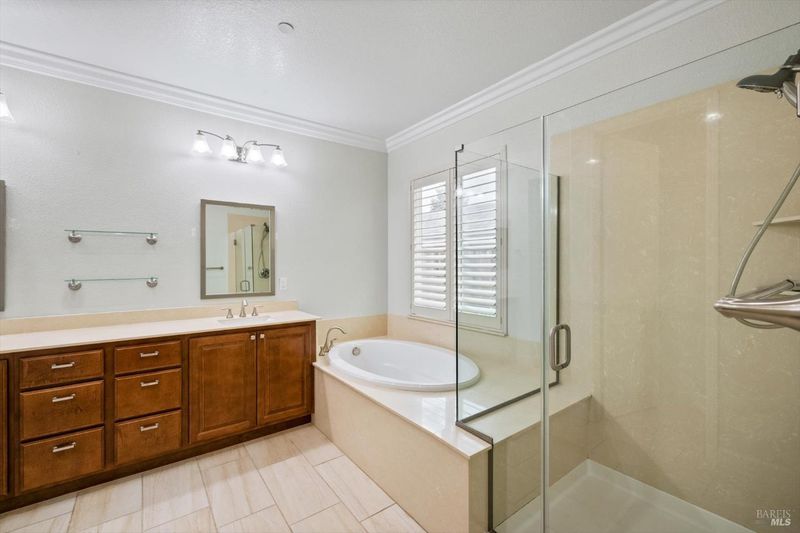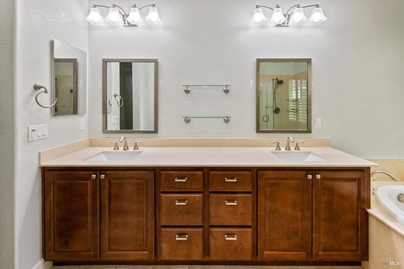 Thoughtfully designed single-story,3bed,3 bath,2687' of living space on a generous 10,778' corner lot. Interior features tile and engineered hardwood like flooring throughout, complemented by plantation shutters that add both style and function.The front two bedrooms are connected by a Jack-and-Jill bathroom, while an additional room across the hall is currently used as an office, providing flexible space for a variety of uses such as guest suite, hobbies or work space. Addl highlights include a gas fireplace,oversized kitchen island,water softener, high ceilings for that open airy element, an indoor laundry room and a spacious three-car garage w/ addl storage and epoxy finished floors.The backyard is designed for low-maintenance enjoyment and entertaining, featuring artificial turf, a built-in bbq w/covered pergola, and a charming pathway leading to a tucked-away garden area. A well-balanced blend of comfort, functionality, and indoor-outdoor living, all in a desirable corner-lot setting. Welcome Home