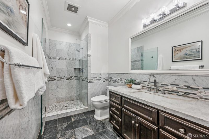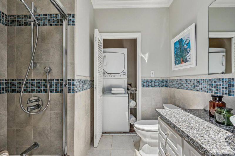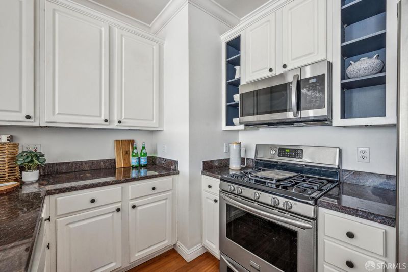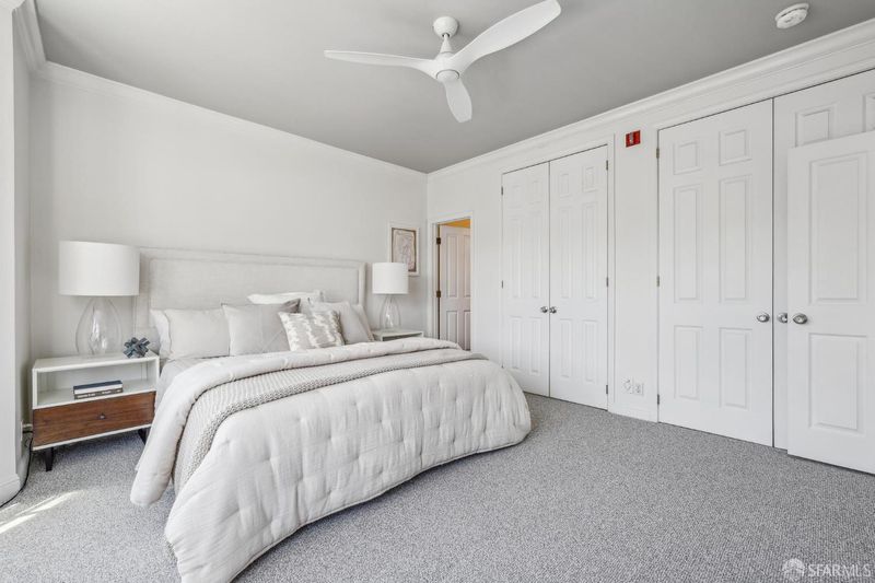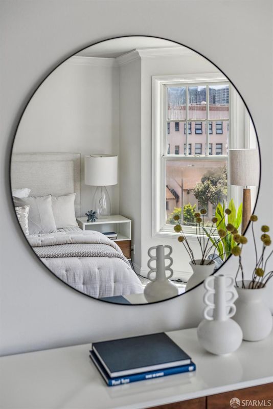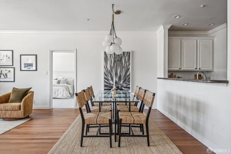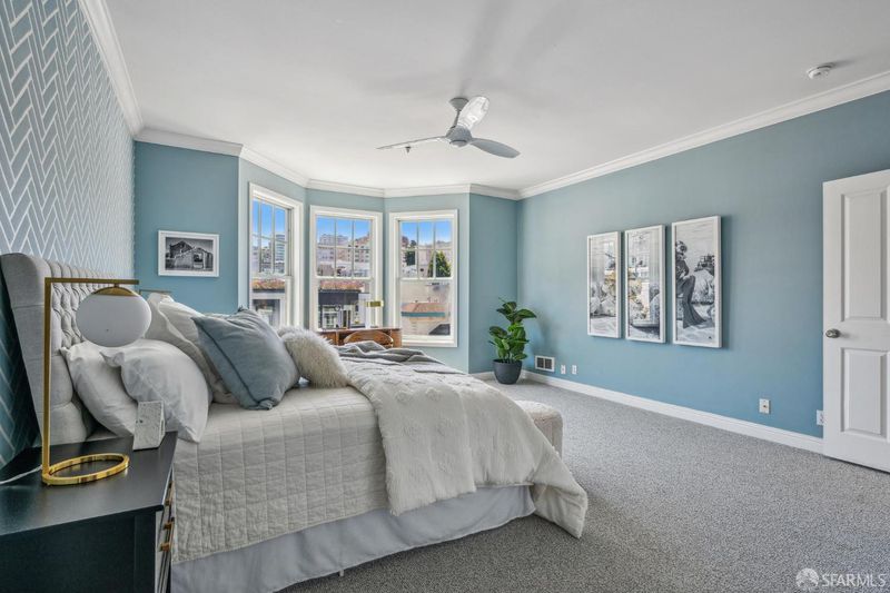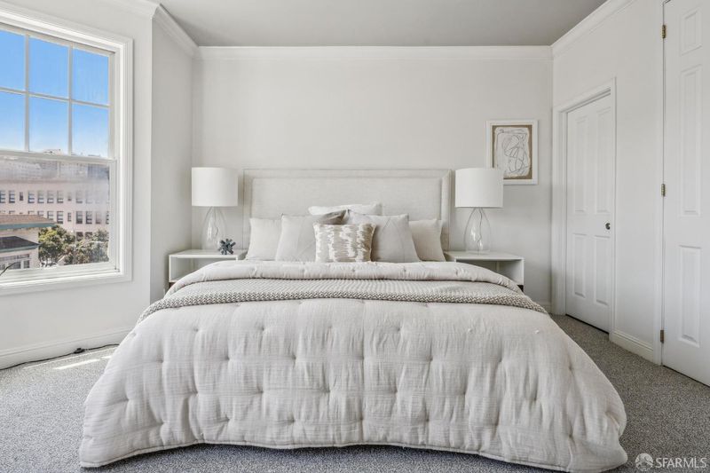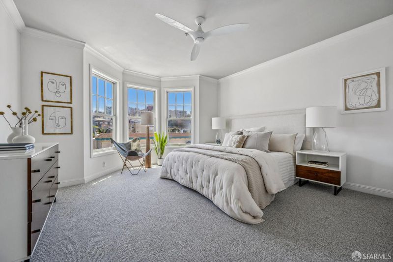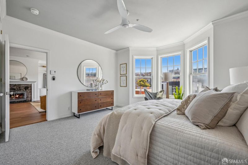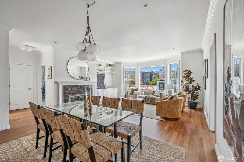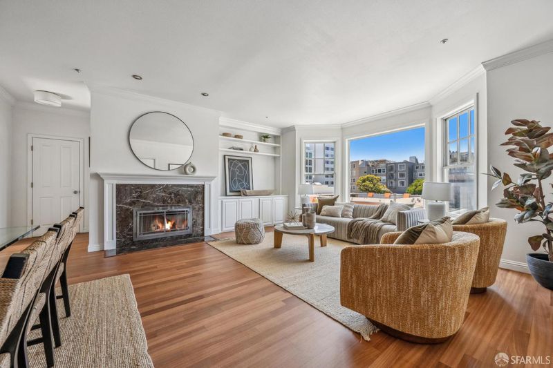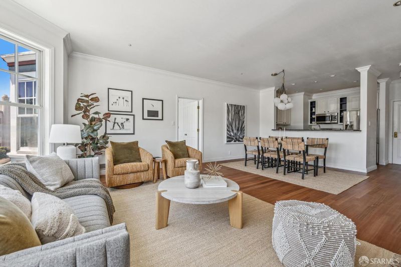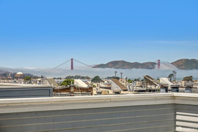 Light pours through oversized bay windows in this top-floor Cow Hollow home, where airy ceilings and freshly refinished hardwood floors set the tone for laid-back elegance. The open-concept great room blends kitchen, living, and dining around a cozy fireplaceperfect for slow mornings or lively evenings. Two generous bedrooms and two full bathsincluding a serene en-suiteoffer comfort and flexibility, with ample closet space throughout. Step just outside your door to a shared roof terrace with sweeping Golden Gate Bridge viewsan easy daily indulgence from this top-floor perch. Unit 301 includes garage parking and a private storage room large enough for all the gear that fuels an active SF lifestylesurfboards, bikes, luggage, you name it. Reasonable HOA dues make it all the more appealing. Positioned at the crossroads of Cow Hollow charm, Polk Street buzz, and Fort Mason greenspace, this is city living at its bestbright, connected, and effortlessly livable.