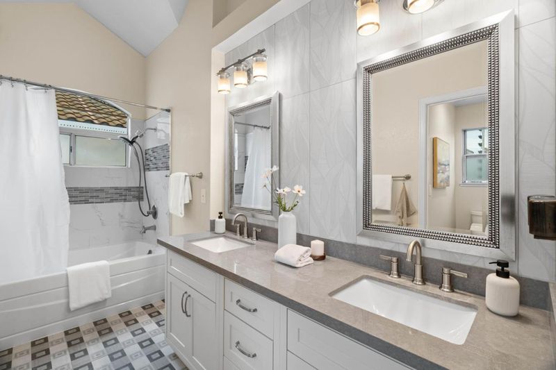 - Double Sinks, Half on Ground Floor, Primary - Oversized Tub, Shower over Tub - 1, Stone, Tile, Updated Bath